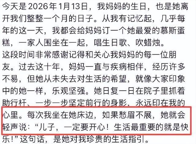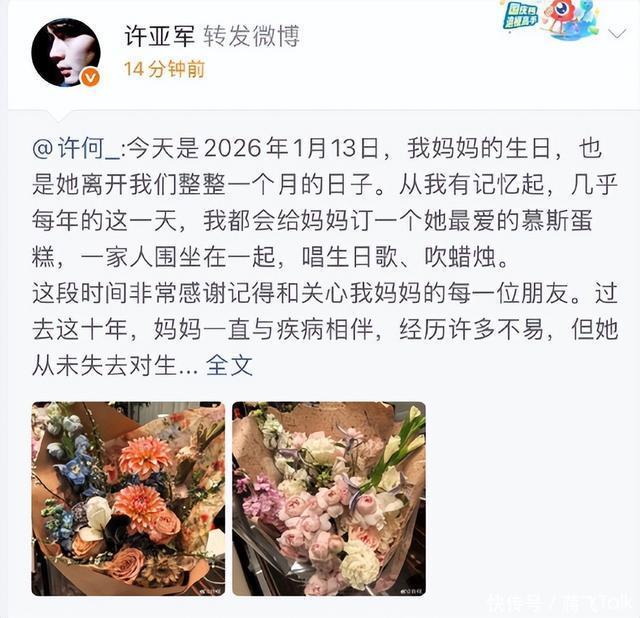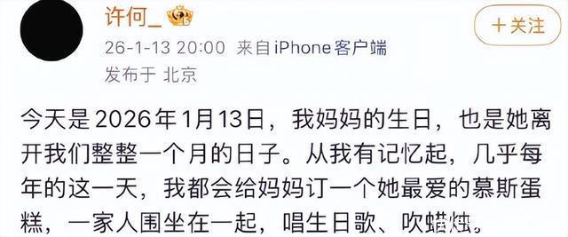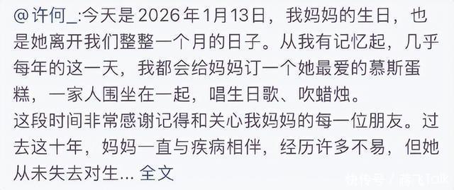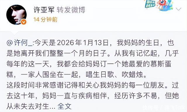1月13日,对于很多人来说可能只是一个普通的日子,但对于何晴的家人和粉丝而言,这一天却有着特殊的意义。 这一天既是何晴的62岁冥诞,也是她离开人世整整一个月的日子。 就在这一天,何晴的儿子许何在社交媒体上发布了一篇长文,缅怀母亲的同时,也揭开了父亲许亚军多年来不为人知的付出。 2025年12月13日,何晴在北京安然离世,享年61岁。 这个消息传出后,无数网友为之悲痛,大家纷纷回忆起何晴在荧幕上塑造的那些经典角色。 如《西游记》中的怜怜、《红楼梦》中的秦可卿、《三国演义》中的小乔以及《水浒传》中的李师师。 她是中国内地唯一一位演遍四大名著的女演员,被誉为“古典第一美女”,她的离去无疑是演艺圈的一大损失。 12月15日,何晴的告别仪式在北京昌平殡仪馆举行。 在这场简单而肃穆的仪式上,何晴的儿子许何怀抱母亲的骨灰盒,独自面对各方吊唁者。 然而,本应在这种时刻给予支持的父亲、何晴的前夫许亚军,却缺席了这场告别仪式。 更有甚者,网络上还传出了许亚军身在美国、与小儿子在餐厅用餐的照片。 对比之下,舆论瞬间引爆。 网友们纷纷指责许亚军薄情寡义,即便离婚多年,也不该在儿子最需要支持、前妻最后一程时缺席。 何晴与许亚军的感情过往再度被翻出,两人因1995年合作《风荷怨》结缘,当时许亚军尚未离婚,这段恋情曾引发巨大争议。 他们于2001年生下儿子许何,但婚姻仅维持三年便告终结。 在公众印象中,许亚军的情感经历复杂,这次缺席葬礼更强化了其“负心”形象。 面对铺天盖地的指责,许亚军始终保持着沉默,这份沉默,在当时看来,更像是无情的默认。 直到何晴去世整整一个月,也是她62岁冥诞的那天,儿子许何的一封长文,才终于揭开了所有谜团,让世人看到了一个完全不同的故事。 他感谢这段时间记得和关心母亲的每一位朋友,同时也透露过去的十年,何晴一直与疾病相伴,经历了诸多不易,但她从未失去对生活的希望,就像大家印象中的她一样,乐观、坚强。 每次许何坐在母亲的床边,如果愁眉不展,她就会轻声说:“儿子网上配资网,一定要开心!生活最重要的就是快乐!” 除了谈到和母亲相处的幸福时光外,许何也提到了父亲许亚军和继母张澍。 许何在文里写得清清楚楚,从妈妈2015年查出脑瘤开始,爸爸其实一直没停过帮忙,所有医疗费都是他兜着,还特意用儿子的名义转生活费,就怕伤到妈妈的自尊。 继母张澍呢,也没少操心,帮着照顾日常,还稳着后方。 葬礼那天许亚军真回不来,是因为在美国陪小儿子有重要学术活动,只能托朋友帮忙送花圈啥的。 哎,生活有时候就是这么巧,表面看冷冰冰,背地里全是热乎劲儿。 许亚军每次都是以儿子名义支付了这些费用,转账记录备注为“许何代付”,十年间从未间断。 即使2023年后何晴病情恶化、需使用单价三万元的新型免疫制剂,资金依然准时到位。 此外,许亚军安排每周送去何晴爱吃的进口水果,并谎称是儿子心意。 离婚后,许亚军与何晴并未交恶,反而维持着朋友关系。 许亚军再娶张澍后,家庭关系依然融洽。张澍为何晴送去她喜爱的昆曲唱本,陪她做语言康复训练。 许何亲切称张澍为“澍妈”,称其与父亲“用最安静的方式,在背后默默帮助我妈妈”。 对于缺席葬礼,许何解释这与母亲意愿直接相关。 何晴希望安静离开,不愿病情成为公众焦点。 许亚军尊重其意愿,未赶回参加公开仪式。 许何的长文发布后,迅速在网络上引起了轩然大波。 许多网友被许何的深情和懂事所打动,也对许亚军和张澍的默默付出表示敬佩。 他们纷纷留言表示,之前对许亚军的误解是错误的,原来他一直在用自己的方式爱着何晴和儿子。 演员邢岷山等好友也发声支持许亚军,透露何晴术后情绪崩溃时,许亚军曾在病房外守整夜,地上一地烟蒂。 这些细节让大家更加了解到许亚军对何晴的深情。 何晴和许亚军的故事,也引发了人们对于重组家庭的思考。 在现实生活中,重组家庭往往面临着诸多挑战和困难,如何处理好与前任、现任以及孩子之间的关系,是一个需要认真对待的问题。 从何晴和许亚军的例子中,我们可以看到,他们虽然离婚了,但并没有因此而成为仇人。 相反,他们为了孩子,保持着良好的沟通和合作。 许亚军在何晴生病期间的默默付出,以及张澍对许何的视如己出,都让人感受到了重组家庭中的温暖和爱。 何晴虽然离开了我们网上配资网,但她的精神却永远留在了人们的心中。 何晴的演艺生涯也是辉煌的,她塑造的那些经典角色,将永远留在观众的记忆中。 她用自己的演技和才华,为中国的影视事业做出了重要贡献。 她的离去,是演艺圈的一大损失,但她的精神和作品将永远激励着后人。 何晴离世一个月,儿子许何的长文让我们看到了一个不一样的故事。原来,许亚军并非薄情寡义,他的深情藏在沉默里。 他用自己的方式,默默守护着何晴和儿子,尊重着何晴的意愿。 大概许亚军也没想到,前妻何晴去世1个月,24岁的儿子竟成为了他职业生涯中唯一的“救赎”,将他崩掉的口碑再次拉回来。 同时,何晴的故事也让我们感受到了母爱的伟大和生命的脆弱。 愿何晴在另一个世界安好,也希望许何能够在家人的陪伴下,早日走出悲伤,迎接新的生活。