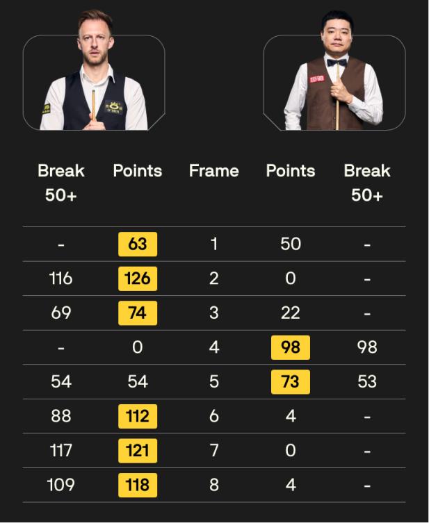 丁俊晖和特鲁姆普此前曾22次交手,丁俊晖以9胜13负稍处下风,其中最近三次对决均以特鲁姆普获胜告终。本场比赛开局,特鲁姆普迅速进入状态,连胜三局并在第二局打出单杆过百,确立领先。第四局丁俊晖轰出单杆98分扳回一城,并在局休过后,再打出单杆53分,将比分追至2比3,重现一丝希望。