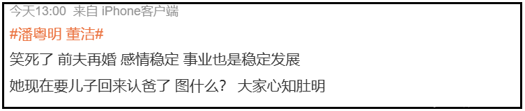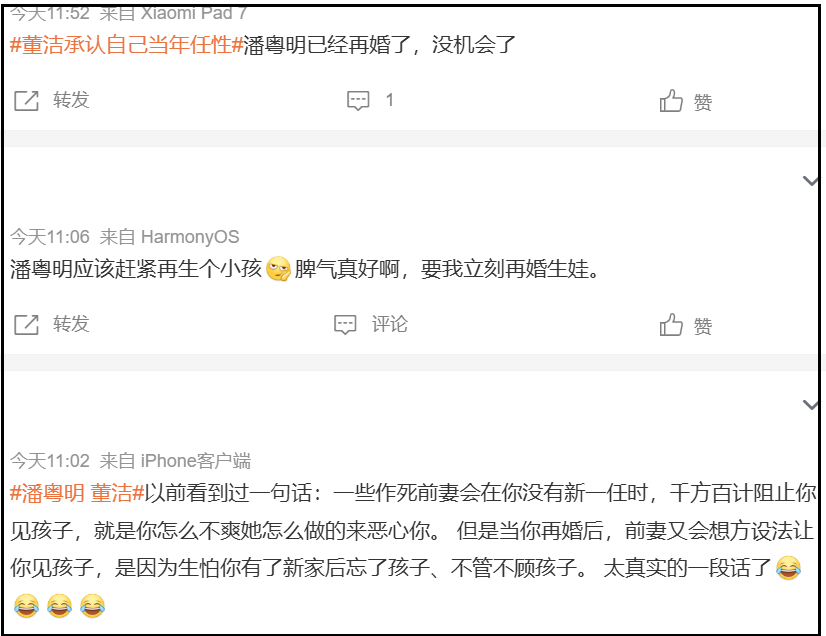 董洁相关热搜之下,网友的大实话一句比一句不好听,有人劝潘粤明赶紧再要一个小孩,有人感慨潘粤明再婚之后,董洁态度变化太明显了。