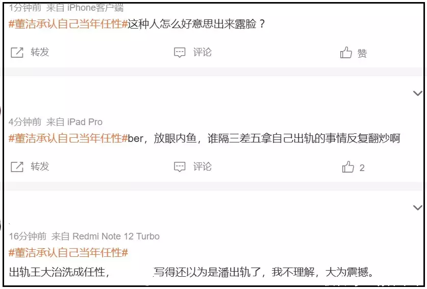 针对董洁,网友的吐槽就更多了,每一次潘粤明语焉不详,后续总是有董洁身影出现,紧跟着一起上热搜。