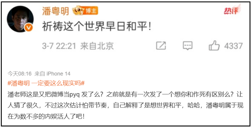 直到潘粤明在评论区补充了一句“祈祷这个世界早日和平”,才打消了进一步猜测。