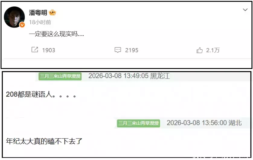 针对潘粤明,在网友看来,他太喜欢隔空喊话了,还总是语焉不详引人联想,譬如热搜上的那条“一定要这么现实吗”,就很容易被误会成感情问题。