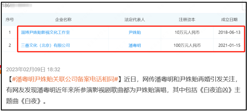 还有网友晒出了尹姝贻的朋友圈,表示尹姝贻还在帮潘粤明宣传电影,双方并没有分手,两个人公司备案电话都是一样的。