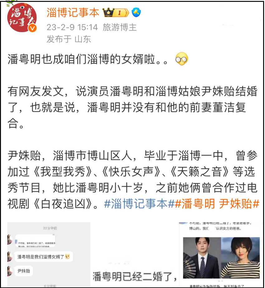 不过很快就有知情人出面辟谣,表示潘粤明已经和女星尹姝贻再婚了,尹姝贻老家淄博的自媒体账号也出面认了潘粤明这个女婿。