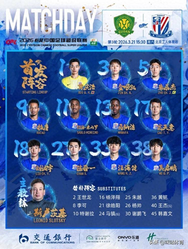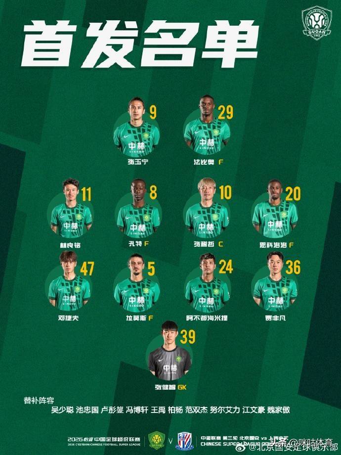 中超第三轮焦点战“京沪德比”首发阵容出炉,国安与申花均受到伤病影响,两队皆人员不齐。