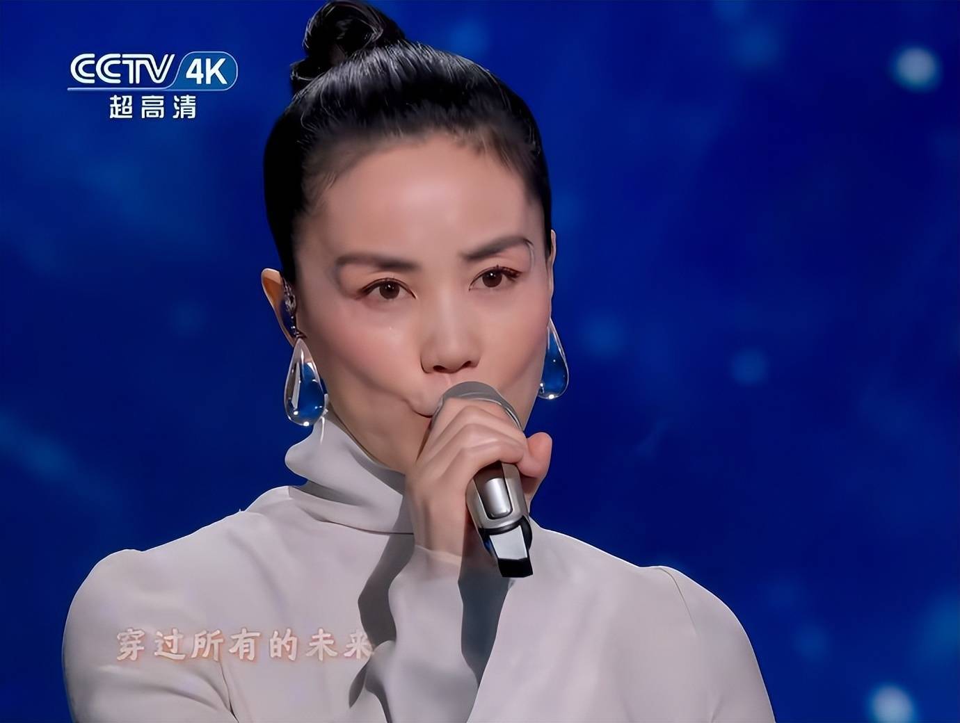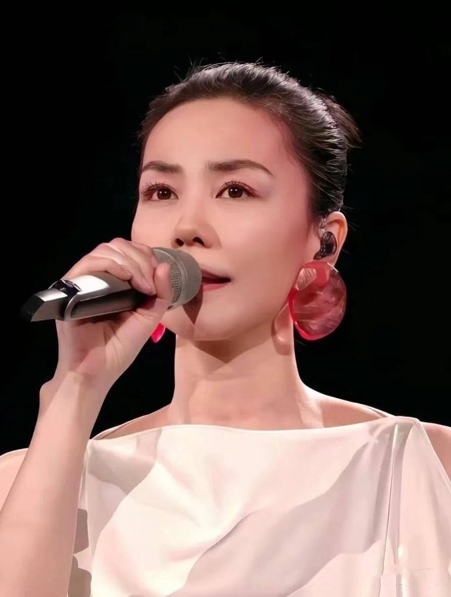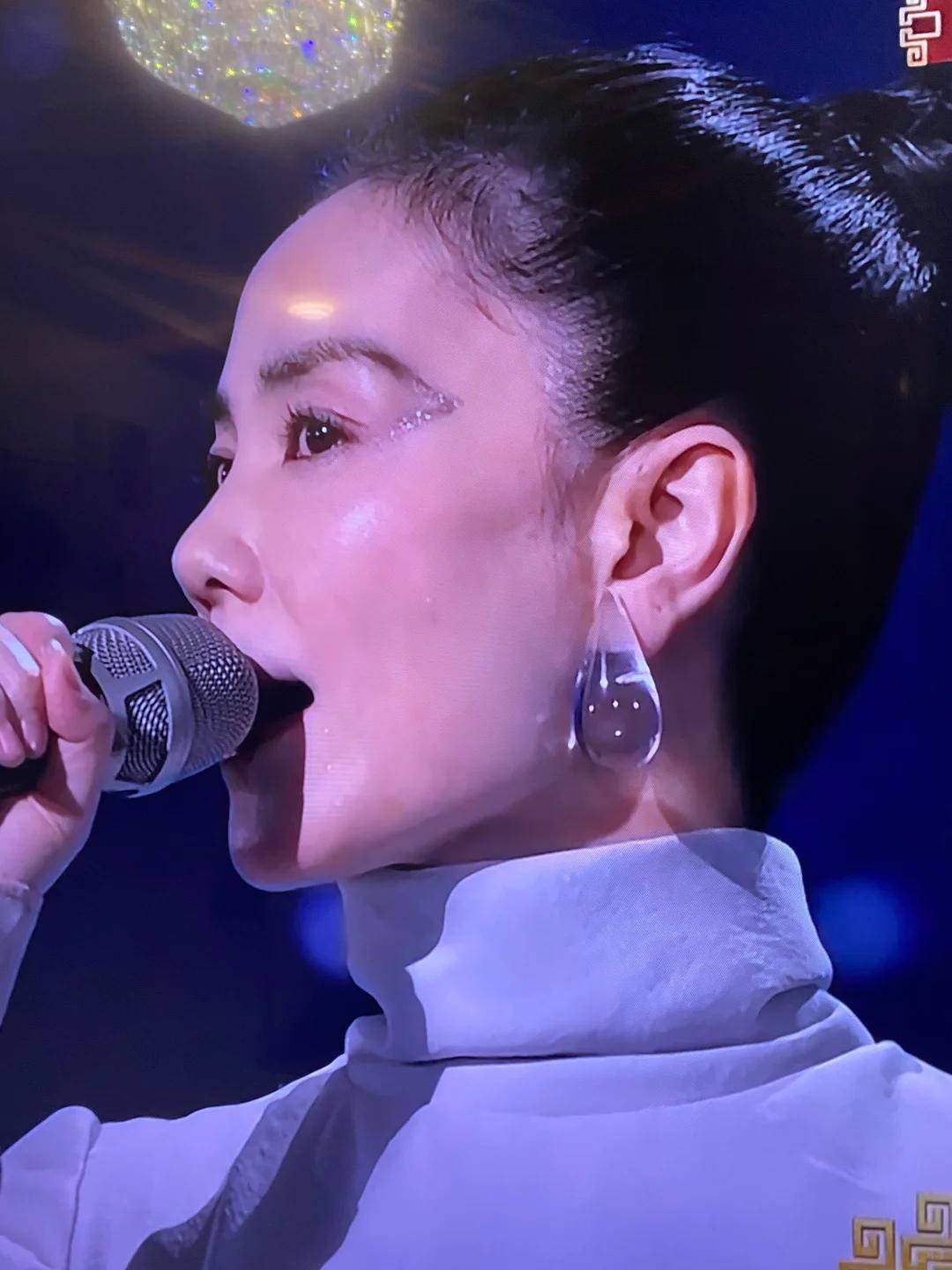去年王菲上春晚,穿着一身无袖白色长裙,虽然妆容淡淡的,但虾片耳饰和太阳穴的红色眼影还是很独特的,让人有记忆点。