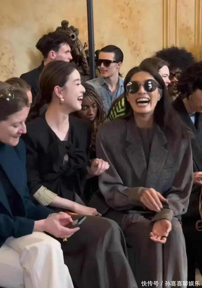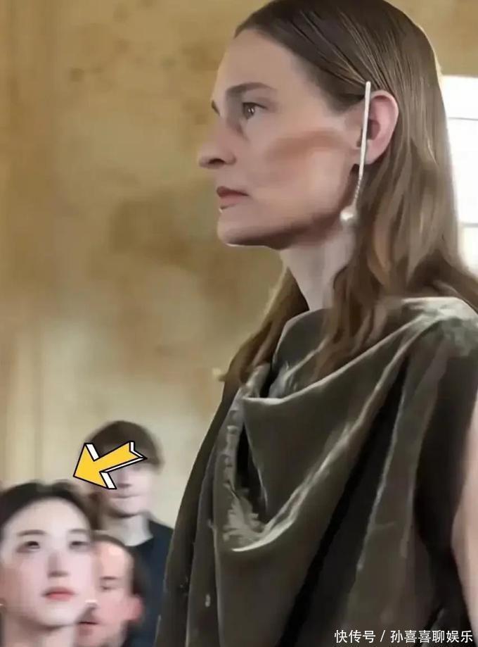 整场秀,她大部分时间都保持着那种“姐很高贵,凡人勿近”的标配姿态。可偏偏有那么一个瞬间,她不知道被什么逗乐了,突然咧嘴大笑起来。就这一下,精心维持的“女神氛围感”咔嚓裂了道缝——眼角的鱼尾纹跑了出来,笑容也显得有点用力。是啊,再厉害的女神也逃不过地心引力,31岁的脸,大笑的时候,保养得再好也会露出岁月的痕迹。
